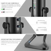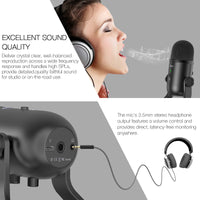 The desk microphone's 3.5mm stereo headphone output features a volume control and provides direct, latency-free monitoring anywhere, adjustable volume ensures monitoring quality and convenience.